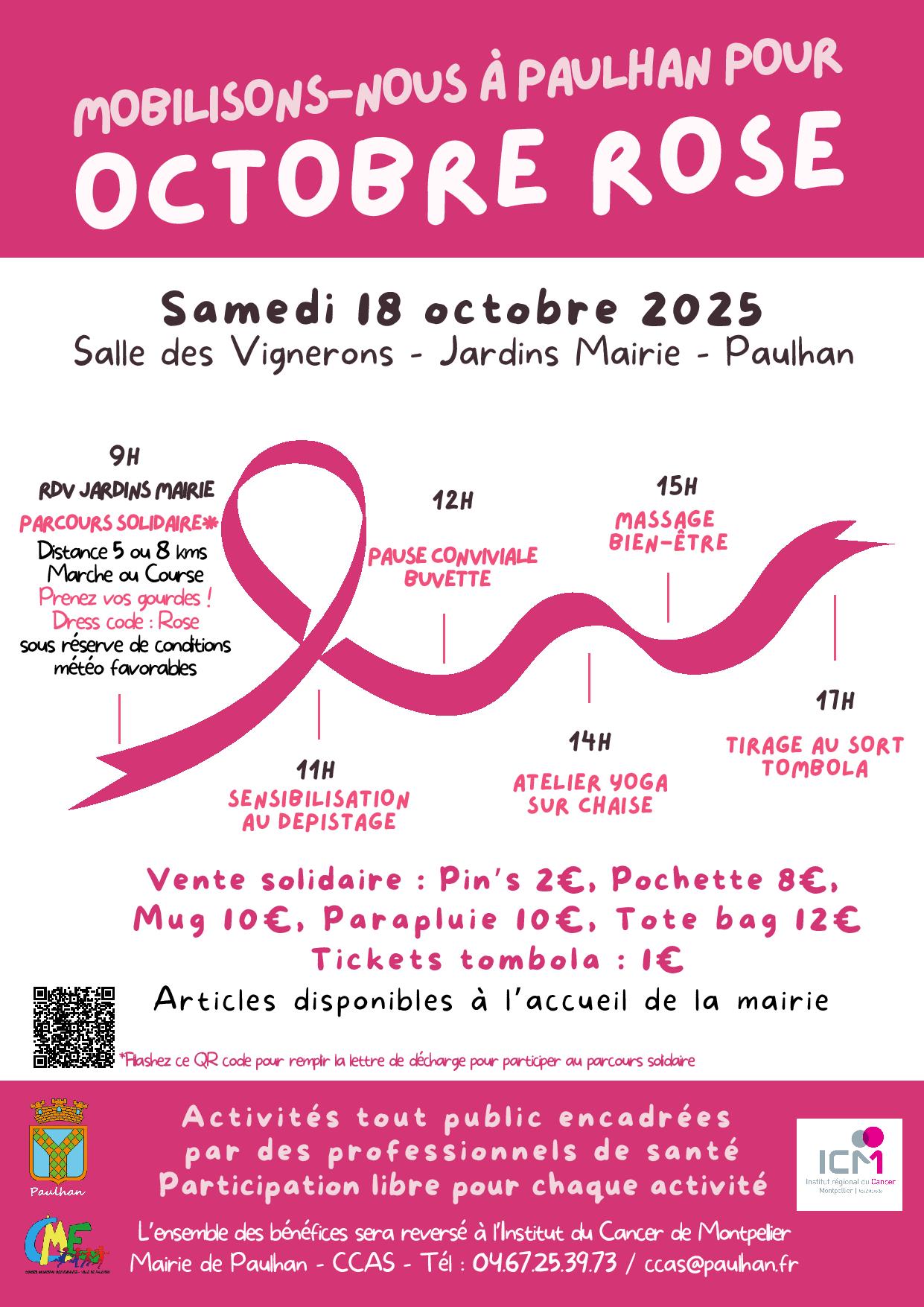 Le dépistage, un enjeu majeur de santé publique ! Le cancer du sein reste la première cause de mortalité par cancer chez la femme. Son dépistage est un enjeu majeur de santé publique.En effet, détecté tôt, un cancer du sein se guérit dans plus de 90% des cas ! Si le cancer du sein peut survenir à tout âge, il touche le plus fréquemment les femmes après la ménopause. C’est dans cette optique que les autorités sanitaires en France proposent à toutes les femmes entre 50 et 74 ans, ne présentant ni symptômes, ni antécédents familiaux du cancer du sein et de l’ovaire, ni de mutation génétique, de se faire dépister tous les 2 ans dans un centre de radiologie agréé dont l’ICM fait partie. En fonction du niveau de risque, chaque femme peut être orientée et suivie de façon adaptée. Le parapluie rose est devenu le symbole fort d'Octobre Rose et du dépistage du cancer du sein. En effet, le parapluie rose protège comme le dépistage protège du cancer du sein. Venez soutenir la cause et participez aux évènements organisés par la municipalité de Paulhan le samedi 18 octobre, dans les jardins de la mairie :