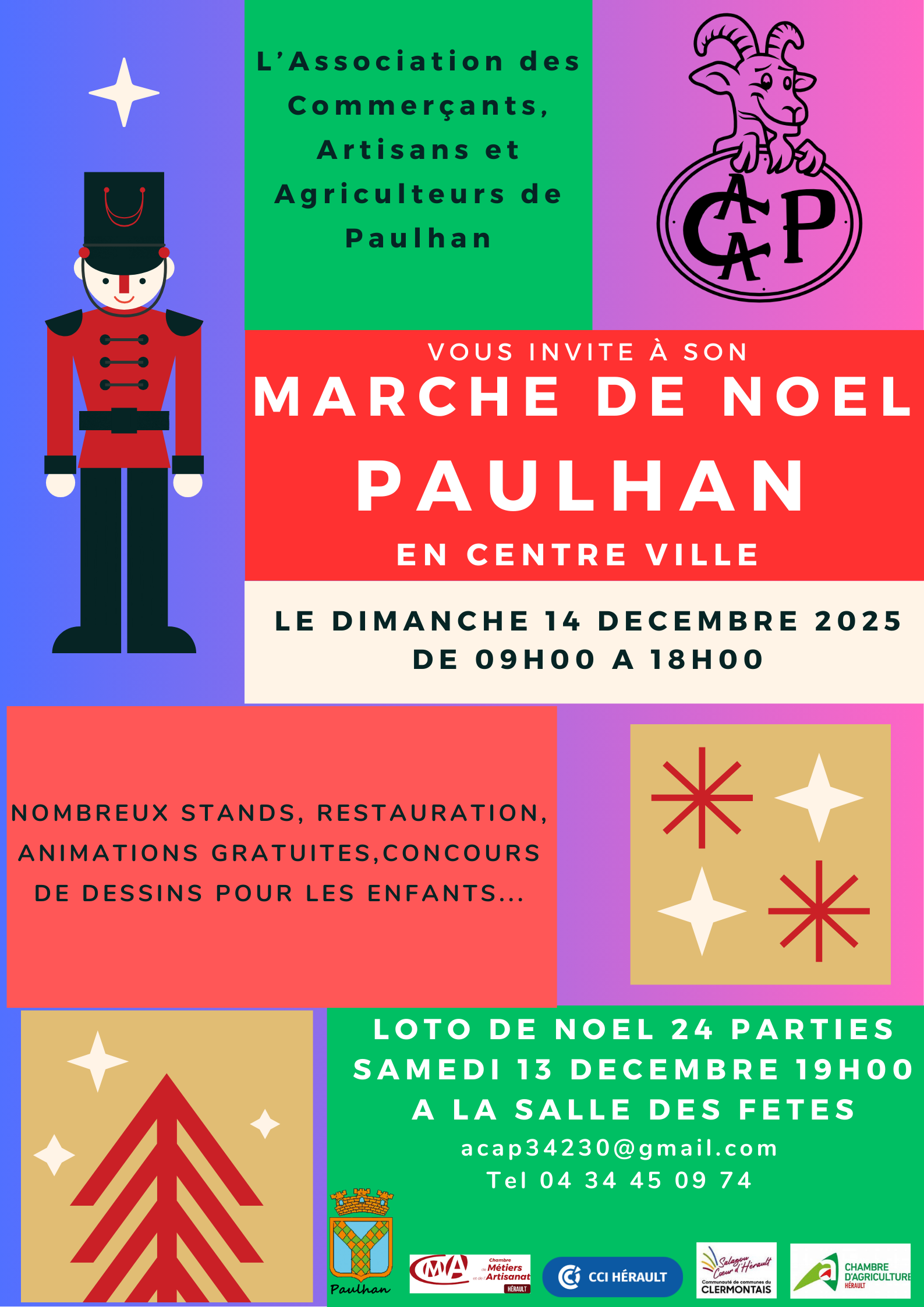 L'association des Commerçants, Artisans et Agriculteurs de Paulhan vous invite à son week-end de Noël les 13 et 14 décembre 2025. Samedi 13 décembre, à partir de 19h à la salle des fêtes, LOTO de Noël - 24 parties Dimanche 14 décembre, Marché de Noël, à partir de 9h et jusqu'à 18h, en centre-ville. Au programme :