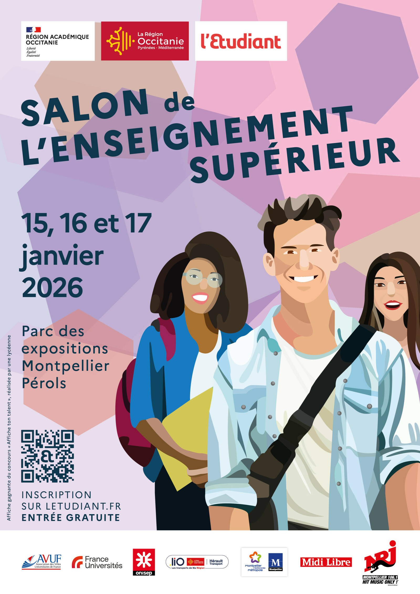 Le Salon de l’enseignement supérieur à Montpellier Invitation gratuite (obligatoire) pour se présenter au salon à télécharger ICI Le Salon de l'enseignement supérieur de Montpellier ouvrira ses portes pour sa 36e édition, les jeudi 15, vendredi 16 et samedi 17 janvier 2026 au Parc des Expositions de Montpellier ! Cet événement incontournable est co-organisé avec la région académique Occitanie et en partenariat avec la Région Occitanie, l'Onisep Occitanie, le CIO et Montpellier Métropole et ville de Montpellier. Quelles poursuites d'études après le bac ? Quel parcours dans l'enseignement supérieur est le plus adapté ? Quelles études pour quels métiers ? Lors de ces journées dédiées à l’éducation, à l'orientation et à l'avenir des jeunes, vous découvrirez un espace riche en opportunités. Ce salon a pour objectif d'accompagner les jeunes dans la construction d'un avenir prometteur. Cet événement leur offre une opportunité unique de découvrir une large gamme de formations et de bénéficier de conseils personnalisés. À travers des conférences, des ateliers et des stands d’information, ils pourront explorer les débouchés professionnels, comprendre les conditions d’admission, découvrir les programmes de formation et rencontrer des représentants et des étudiants de formation supérieure tout en affinant leurs choix d’orientation. À QUI S’ADRESSE LE SALON ?