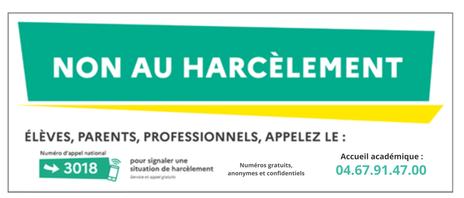 Qu'est-ce que le harcèlement ?Le harcèlement se définit comme une violence répétée qui peut être verbale, physique ou psychologique. Cette violence se retrouve aussi au sein de l’école. Elle est le fait d’un ou de plusieurs élèves à l’encontre d’une victime qui ne peut se défendre. Depuis la loi du 2 mars 2022 visant à combattre le harcèlement scolaire, ce phénomène est reconnu comme un délit. Avec l’utilisation permanente des nouvelles technologies de communication (téléphones, réseaux sociaux numériques), le harcèlement entre élèves se poursuit en dehors de l’enceinte des établissements scolaires. On parle alors de cyber-harcèlement. À votre écoute 30 18 : Élèves, parents, professionnels, un numéro vert et une application mobile pour tout renseignement ou signalement. |