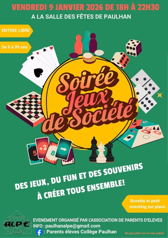 Un moment convivial à ne pas manquer ! L’Association des Parents d’Élèves de Paulhan vous invite à une soirée jeux de société placée sous le signe du partage, du rire et de la bonne humeur ! Vendredi 9 janvier 2026 Que vous soyez petit ou grand, débutant ou passionné, venez profiter d’une large sélection de jeux pour tous les goûts : cartes, dés, plateaux, stratégie ou jeux familiaux. Entrée libre Une soirée idéale pour se retrouver en famille ou entre amis, faire de nouvelles rencontres et créer ensemble de beaux souvenirs. Venez jouer, partager et vous amuser ! |