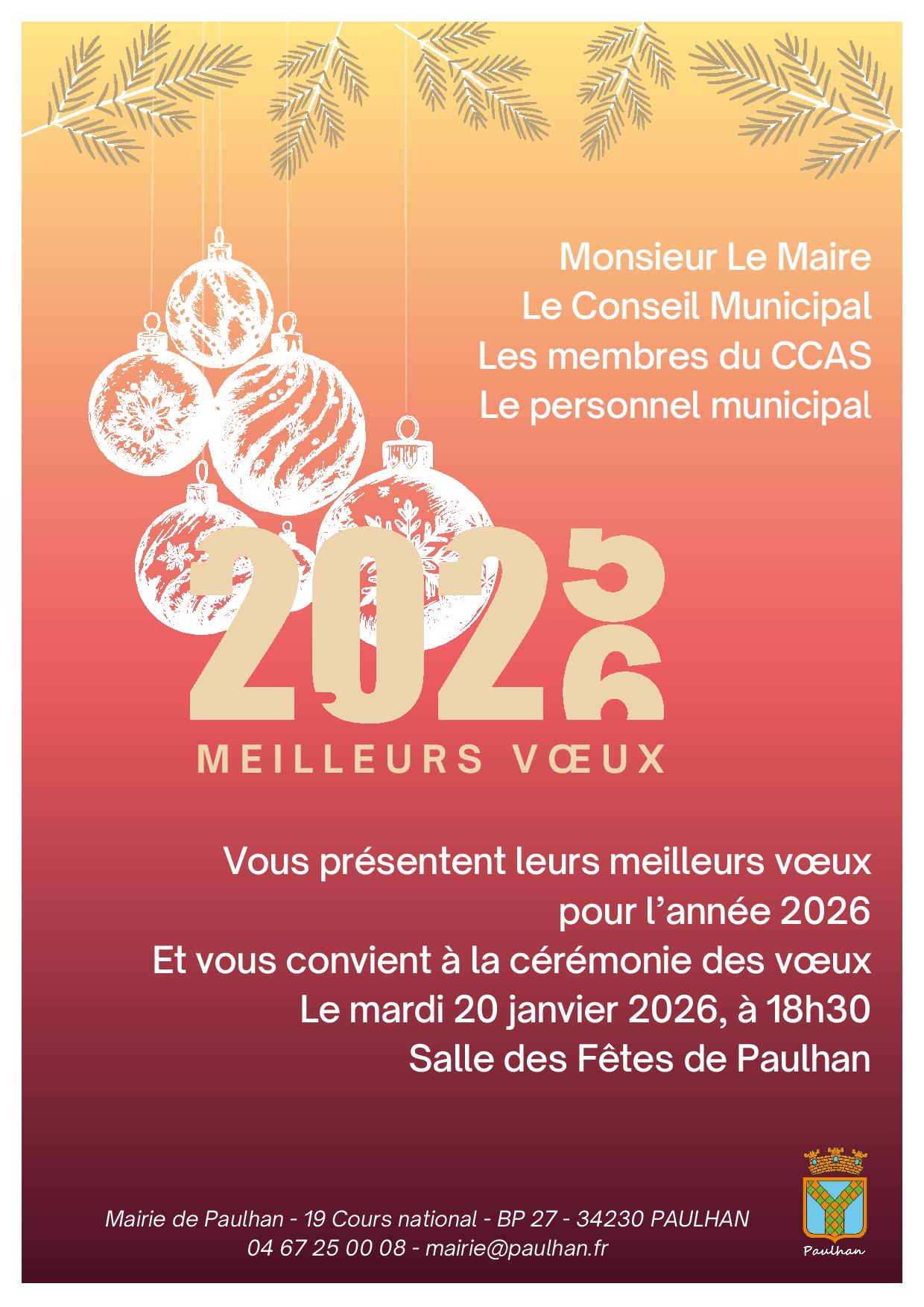 Monsieur le Maire, le Conseil Municipal, les membres du CCAS et l’ensemble du personnel municipal ont le plaisir de présenter leurs meilleurs vœux pour l’année 2026 aux Paulhanaises et aux Paulhanais. À cette occasion, la Municipalité vous invite à participer à la cérémonie des vœux : Mardi 20 janvier 2026 Cette cérémonie constitue un moment de rencontre et de convivialité, ouvert à l’ensemble des habitants et nous serons heureux de vous y accueillir. |