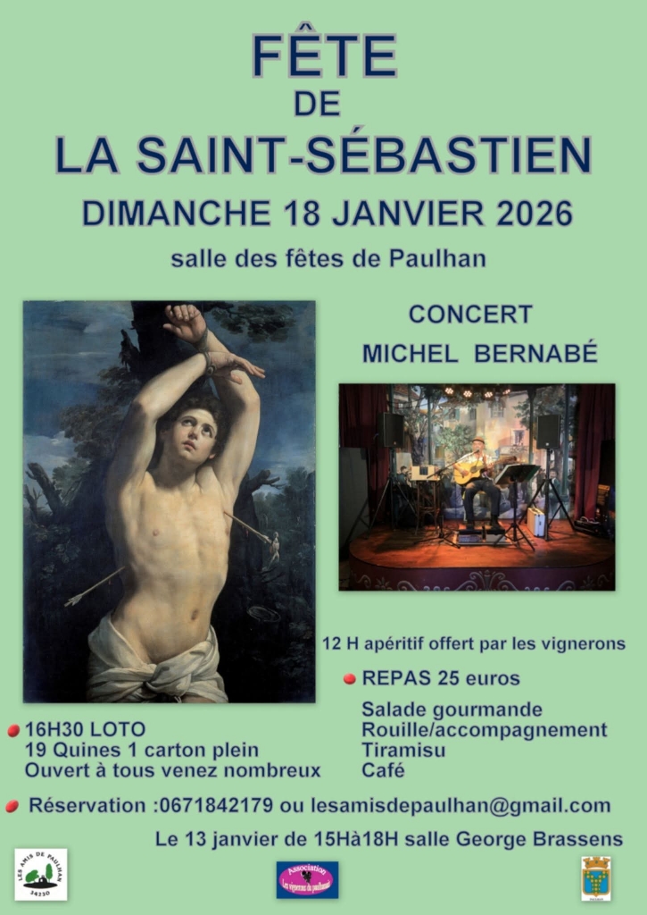 Les Amis de Paulhan vous invite à célébrer la Fête de la Saint-Sébastien le dimanche 18 janvier 2026 à la salle des fêtes dans une ambiance conviviale et festive. Au programme : Réservations : 06 71 84 21 79 ou par Email Nous vous attendons nombreux et nombreuses pour célébrer la Saint-Sébastien à Paulhan ! |