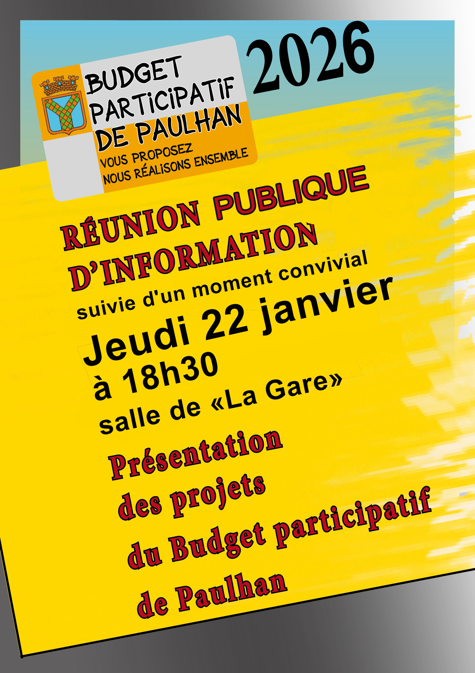 Budget Participatif 2026 Une réunion publique d’information est organisée afin de vous présenter les projets proposés et d'échanger à leur sujet. Jeudi 22 janvier La discussion pourra se prolonger autour d'un moment convivial. Vous proposez, nous réalisons ensemble ! |