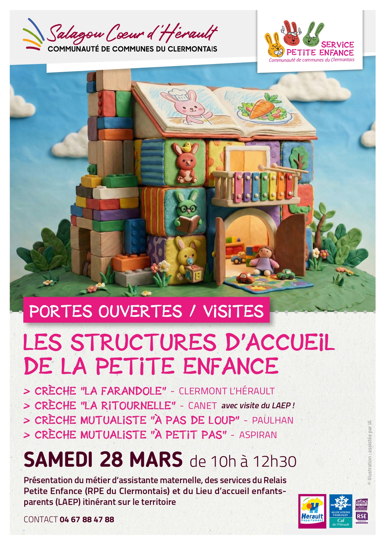Matinée Portes Ouvertes Le samedi 28 mars prochain, le service Petite enfance de la Communauté de communes du Salagou Coeur d’Hérault ouvre les portes de ses 4 structures sur le territoire pour une matinée d’informations et de visites pour les parents et futurs parents en recherche d’un lieu d’accueil pour leurs enfants. Parmi les lieux d’accueil, la collectivité compte deux crèches (La Farandole à Clermont l’Hérault et La Ritournelle à Canet), ainsi que deux crèches mutualistes (À Petits Pas à Aspiran et À Pas de Loup à Paulhan). Cette journée sera donc l’occasion pour les parents comme pour les enfants de visiter les lieux, de découvrir les différentes modalités de garde proposées par notre Communauté de communes et de discuter avec les professionnel(le)s et les assistant(e)s maternel(le)s du secteur. Le Relais Petite Enfance et le LAEP Sur les pôles de Clermont l’Hérault (La Farandole) et Canet (La Ritournelle), des agents seront à la disposition des parents pour informer sur les différentes missions du Relais Petite Enfance (RPE) et de L’Arbre à Bulles : Lieu d’Accueil Enfants-Parents (LAEP) itinérant sur le territoire, ouvert aux parents, futurs parents et enfants de 0 à 6 ans accompagnés d’un adulte familier pour partager jeux, découvertes et ouverture à l’autre. Un moment pour se rencontrer, entre parents et entre enfants. Infos pratiques Lieux : |