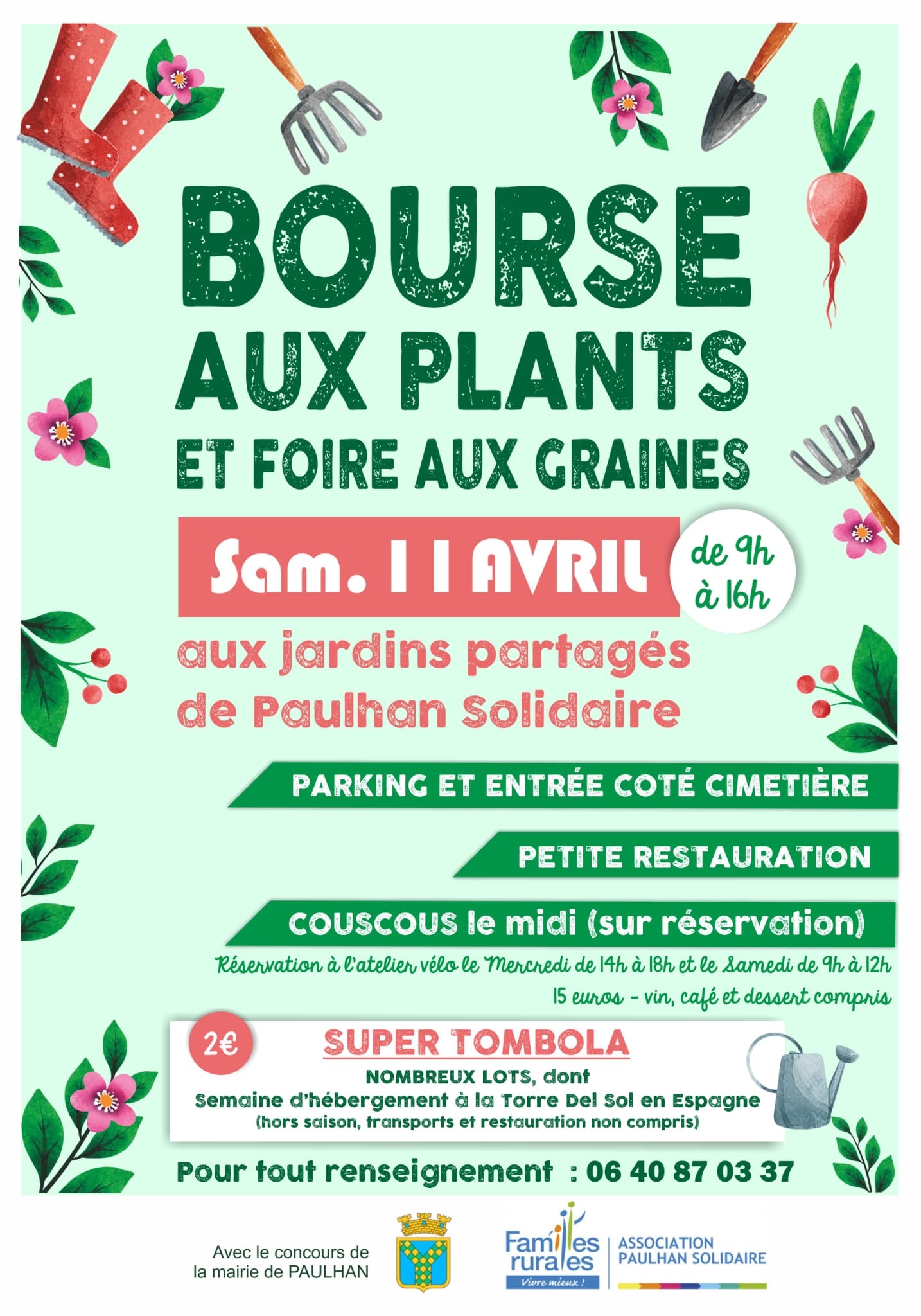 Paulhan Solidaire vous invite à passer une journée conviviale autour du jardinage et de la nature avec la Bourse aux plants et la foire aux Graines ! Samedi 11 avril Jardinier amateur ou passionné, venez échanger, découvrir et partager plants, graines et conseils ! Infos utiles: Accès : parking et entrée côté cimetière Renseignements : 06 40 87 03 37 |