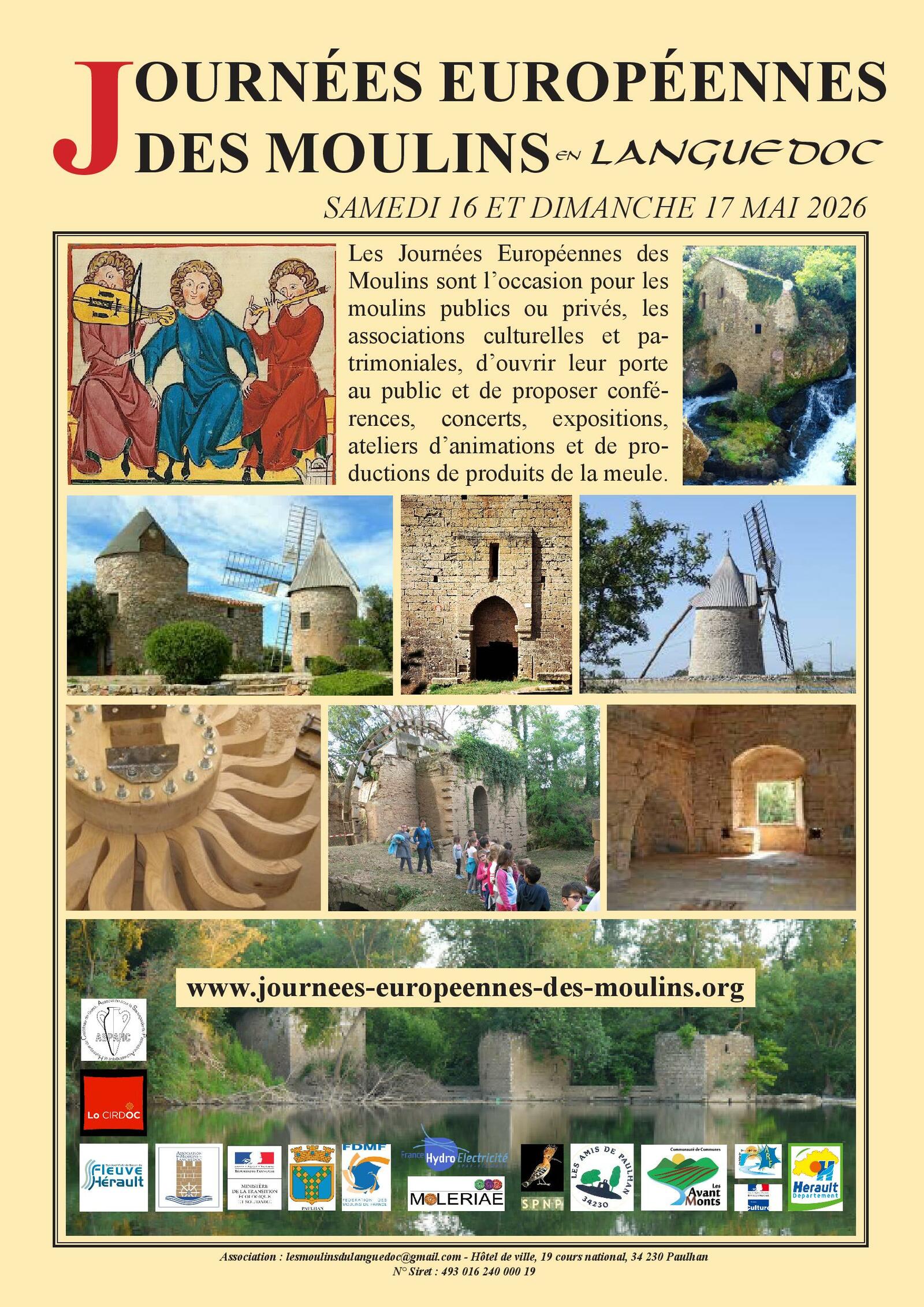 Samedi 16 et dimanche 17 mai 2026 Les journées européennes des Moulins sont l'occasion pour les moulins publics ou privés, les associations culturelles et patrimoniales, d'ouvrir leur porte au public et de proposer conférences, concerts, expositions, ateliers d'animations et de productions de produis de la meule. |