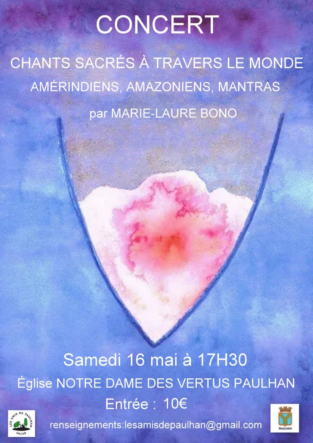 Concert "Chants sacrés à travers le monde" Les Amis de Paulhan vous invitent à un concert donné par Marie-Laure BONO, qui interprètera des chants sacrés à travers le monde (amerindiens, amazoniens, mantras)