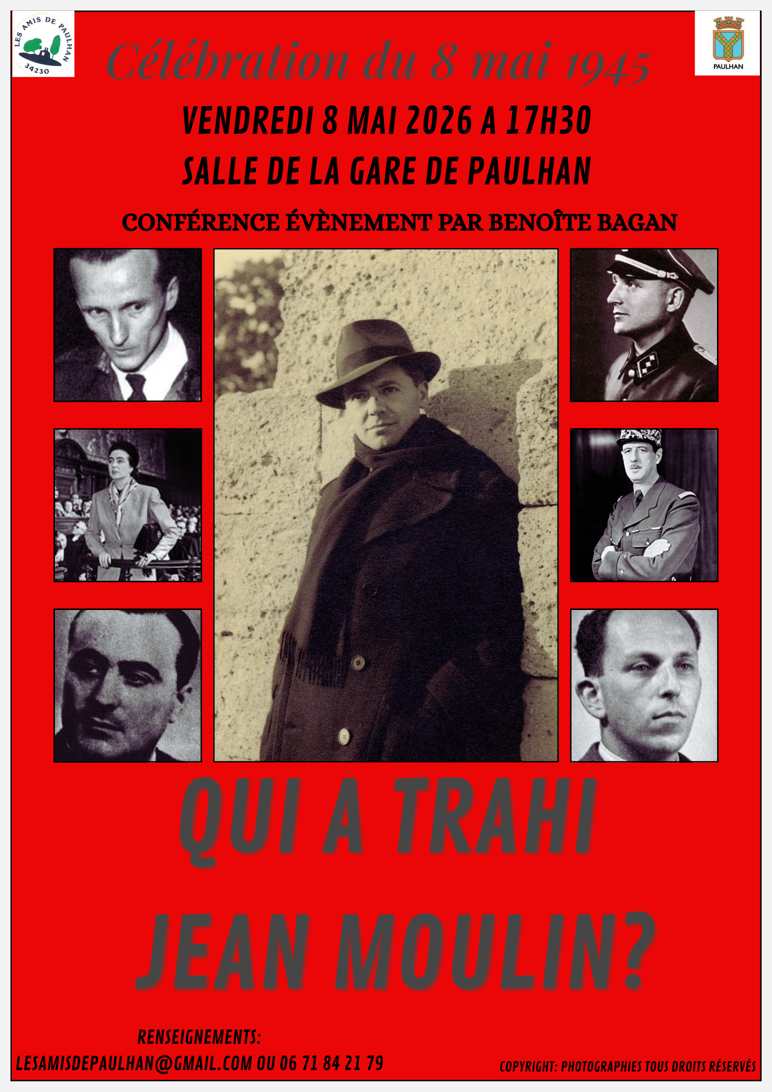 Dans le cadre de la célébration du 8 mai 1945 Les Amis de Paulhan vous invitent à une conférence exceptionnelle proposée par Benoîte Bagan et mêlant mémoire et réflexion historique autour d'une figure emblématique de la résistance française, Jean Moulin. Vendredi 8 mai Un moment fort pour comprendre, échanger et honorer le devoir de mémoire. Infos : 06.71.84.21.79 / email Nous vous espérons nombreuses et nombreux ! |