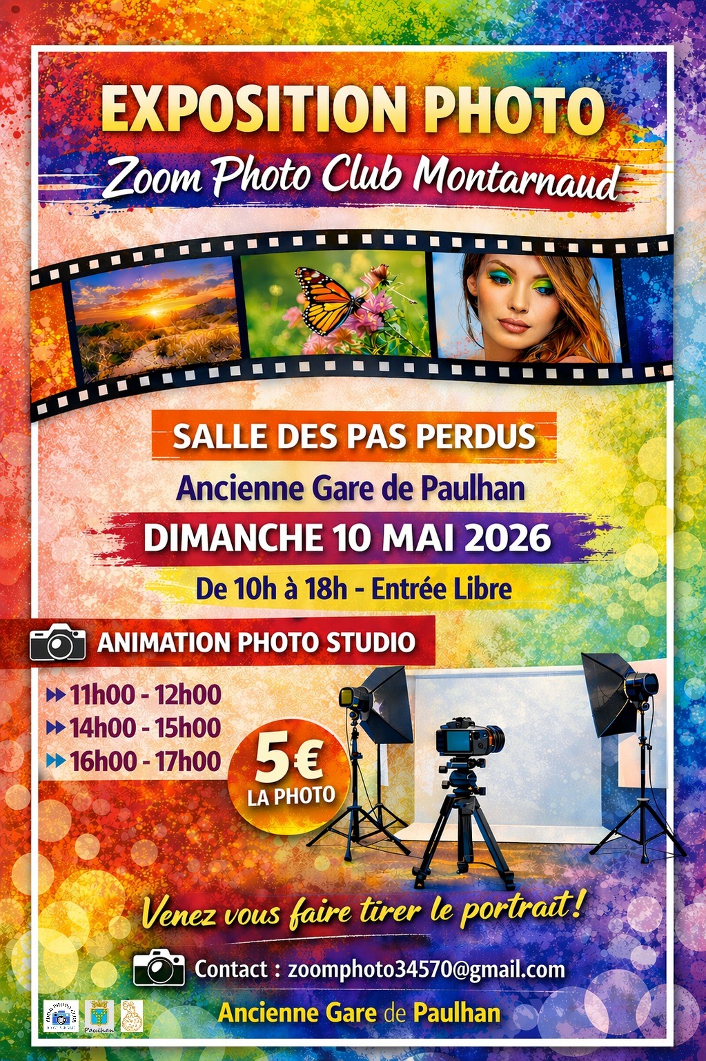 Zoom Photo Club Montarnaud A l’occasion de la Foire des Couleurs, le Zoom Photo Club Montarnaud donne rendez-vous à tous les passionnés d’images pour une exposition à la Gare. Ouvert à tous, cet événement se tiendra le dimanche 10 mai 2026, de 10h à 18h, à la Salle de la Gare. Les visiteurs pourront découvrir une sélection variée de photographies et profiter d’une animation photo studio pour repartir avec leur portrait (participation : 5 € la photo). Une belle occasion de partager un moment convivial autour de la photographie. |
