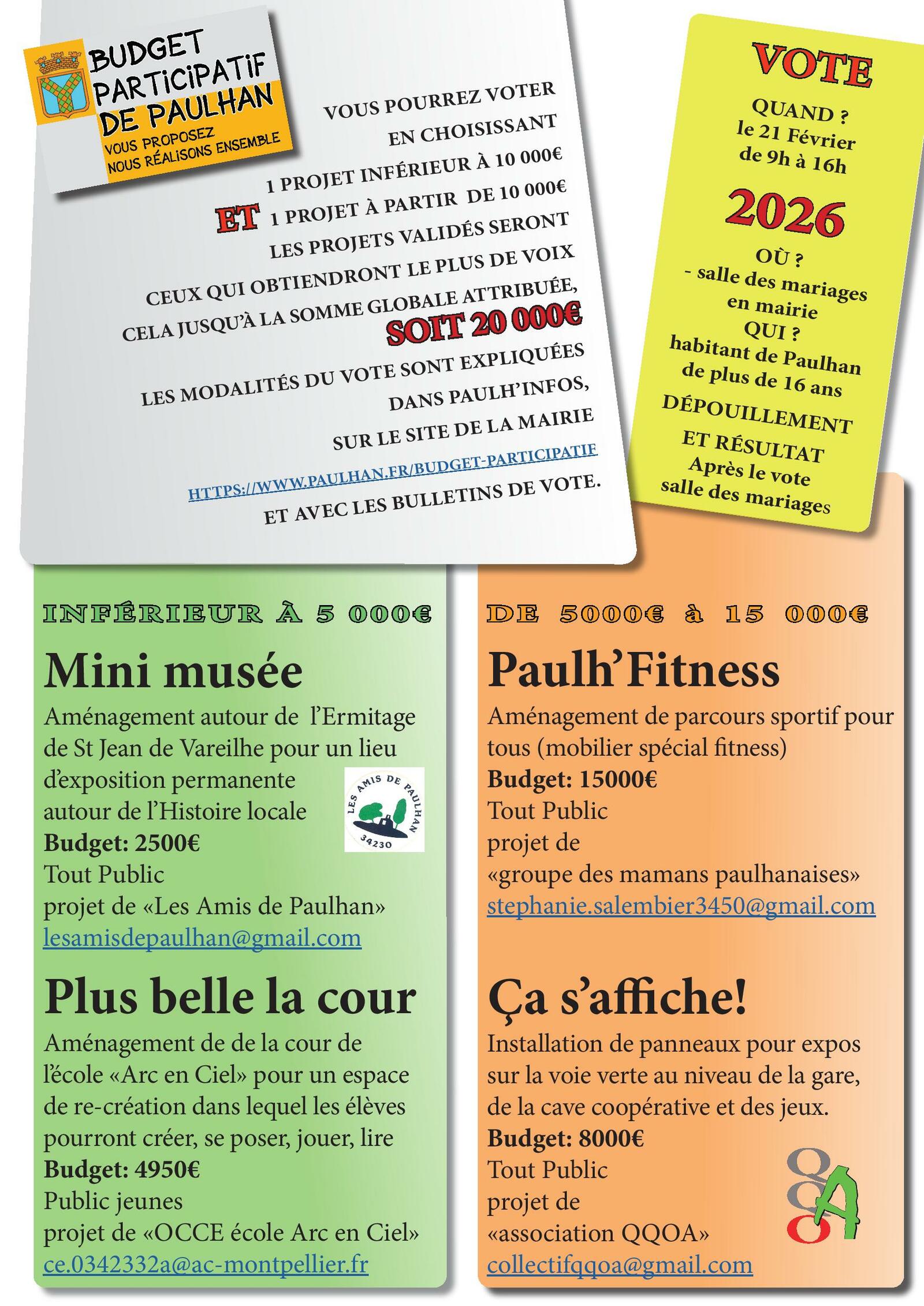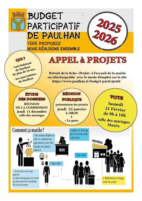 1) Qui peut proposer un projet ?Tous les habitants de PAULHAN, âgés de 16 ans et plus sans condition de nationalité, non élus au Conseil Municipal de la commune pourront faire une proposition, et une seule, de projet d’investissement pour leur quartier ou l’ensemble de la commune. Dans la mesure où un groupe de Paulhanais souhaiterait proposer un projet commun, il devra désigner un mandataire principal qui sera l’interlocuteur privilégié de la commune. 2) Quels types de projets ?Les Paulhanais pourront proposer des projets d’investissement général entrant dans les compétences de la commune de PAULHAN, qui ne généreront pas d’importantes dépenses de fonctionnement (par exemple des frais de personnel important, des dépenses d’entretien substantielles, …) . Si les services techniques municipaux sont sollicités, leur participation et le matériel utilisé devront être chiffrés, la somme ainsi calculée sera incluse au budget prévisionnel du projet. Les projets ne doivent pas avoir d'incidence sur le travail des services municipaux (administratifs et techniques). Les candidats peuvent demander conseil auprès des membres de la commission Budget Participatif. 3) Comment participer ?Les Paulhanais pourront déposer leur projet jusqu’au 27 novembre 2025 inclus, jusqu’à 17 heures. Les dossiers seront adressés à Monsieur le Maire 19, cours National 34230 PAULHAN par pli déposé en mairie contre remise d’un récépissé. Formulaire projet budget participatif 2025-2026 Pourront être annexées au modèle type des pièces complémentaires venant apporter des précisions au projet (exemple : plans, photos, devis…).